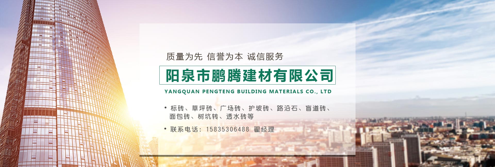 陽(yáng)泉市鵬騰建材有限公司以生產(chǎn)爐渣免燒磚、混凝土廣場(chǎng)磚、路面磚、路沿石、草坪磚、護(hù)坡磚等水泥制品為基礎(chǔ)產(chǎn)業(yè),兼營(yíng)粉煤灰、工業(yè)石膏、石料、沙土、水泥等建筑材料銷(xiāo)售,同時(shí)積極研發(fā)粉煤灰浮選提煉金屬鉬、鈷等稀有金屬的高附加值項(xiàng)目。